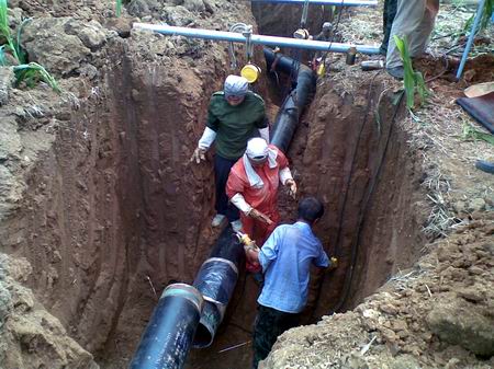 工地上,轟隆隆的挖掘機(jī)一刻不停地加緊作業(yè),龐大的壓路機(jī)穿梭來往,場(chǎng)外的施工人員忙著鋼管焊接、溝槽回填……各項(xiàng)工作如火如荼、緊張有序地進(jìn)行著。此時(shí)雖已避過高溫時(shí)段,但酷熱煩悶的高溫天氣還是讓人難以忍受,站在那里沒幾分鐘,我便開始渾身冒汗了。望向旁邊的施工人員,烈日的暴曬和電焊的灼熱早已使他們衣衫浸透、汗流浹背,而他們卻渾然不覺,臉上滿是認(rèn)真專注的神情。此時(shí)此刻,我才真正體會(huì)到他們嘴中所說的“晴天一身汗,雨天一身泥”的含義,這是他們工作狀態(tài)的真實(shí)寫照??粗麄冋橥度氲赝夜ぷ髦?,便不好意思上前打擾,開始獨(dú)自向前走去。