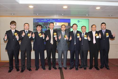 董事局主席王文亮先生(右中)、港交所監(jiān)察部主管簡(jiǎn)嘉穎女士與集團(tuán)管理層在上市儀式上合照