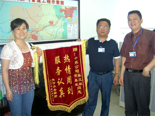 客戶部部長張文獻(xiàn)獲悉后,隨即安排維修人員前去解決。時值炎夏,氣溫居高不下,張文獻(xiàn)部長及維修人員樓上樓下奔走為用戶查找原因,采取排除法,先把用戶家里的煤氣管件全部卸開,察看管道是否有堵塞,最后終于確定是樓下主管道存在故障,于是將樓下主管道打開進(jìn)行清理,最后終于將故障排除,為用戶徹底解決了長期困擾在心頭的煩心事。