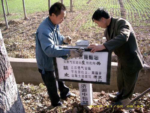 公司首先通過增設(shè)天然氣長輸管線警示樁,進一步做好了安全警示工作。至11月7日,燃氣輸配管理部的工作人員共行進60余公里,栽樁151根。在對警示樁進行精確定位的同時,工作人員還對管道深埋情況作出了標(biāo)注。