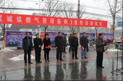 在永城公司,一場(chǎng)聲勢(shì)浩大的《城鎮(zhèn)燃?xì)夤芾項(xiàng)l例》宣傳周啟動(dòng)儀式在永城市人大副主任陳德志及建委主要領(lǐng)導(dǎo)的指導(dǎo)、見證下隆重舉行,永城公司員工及建委燃?xì)廪k相關(guān)人員在盤鼓隊(duì)、宣傳車的配合下,克服雪后濕滑等困難,通過設(shè)立展板、發(fā)放宣傳材料等形式,沿繁華街區(qū)對(duì)《城鎮(zhèn)燃?xì)夤芾項(xiàng)l例》進(jìn)行了巡回宣傳。