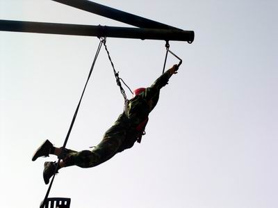 從某種意義上說,空中抓杠環(huán)節(jié)可以說是對(duì)參訓(xùn)隊(duì)員勇氣、膽量和自信的挑戰(zhàn),因?yàn)槊鎸?duì)超出自己掌控能力之外的事物,最大的困難不是來自外界的壓力,而是滋生于內(nèi)心深處的本能恐懼。所以,盡管整個(gè)作業(yè)過程都采取了周密的安全防范措施,但還是能感覺到大家內(nèi)心的不平靜。短暫的調(diào)整之后,有人勇敢地跨出了艱難的第一步,之后的經(jīng)歷證明事情似乎并沒有想象中的那么難。正如俗話所說的那樣,給自己以足夠的信心和勇氣就沒有完不成的任務(wù),誰說不是呢?