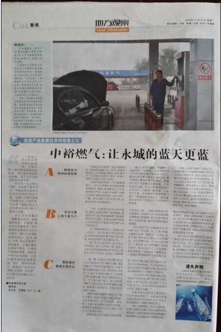 11月11日、11月21日,《河南青年報(bào)》、《今日永城》分別在重要位置以《中裕燃?xì)猓鹤層莱堑乃{(lán)天更藍(lán)》、《天然氣:給力‘藍(lán)天工程’》為題,對(duì)永城公司為“藍(lán)天工程”作出的貢獻(xiàn)進(jìn)行了深入報(bào)道,在廣大市民中引起了廣泛的關(guān)注。